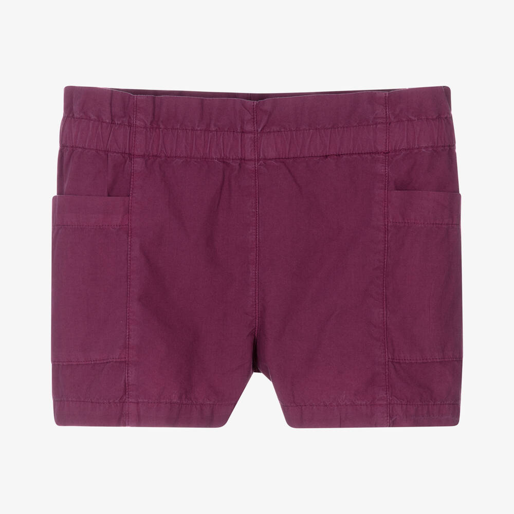 Burgundy purple shorts for little girls by luxury French brand Bonpoint, made in a soft and lightweight cotton weave. Easy to slip on, these casual shorts have an elasticated waistband with a stylish ruffle trim. There are two pockets on the front and an embroidered cherry motif on one side for a designer touch.