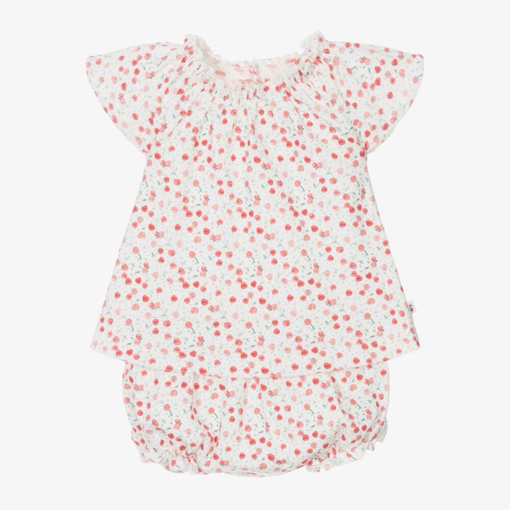 Adorable off-white cotton shorts set for little girls by classic French brand Bonpoint, patterned with the designer's signature red cherries. The top has a frilled, elasticated neckline and raglan-style, short sleeves with button fastenings on the back. The bloomer-style shorts have coordinating, frilled, gently-elasticated cuffs and are easy to wear, simply pulling up.