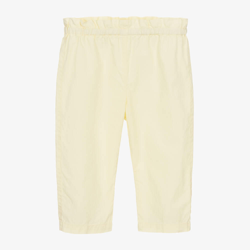 Sweet pale yellow trousers for little girls by luxury French brand Bonpoint, made in soft cotton poplin. Ideal in warmer weather, these lightweight trousers have a stretchy paperbag waistband and a back pocket for a charming look.