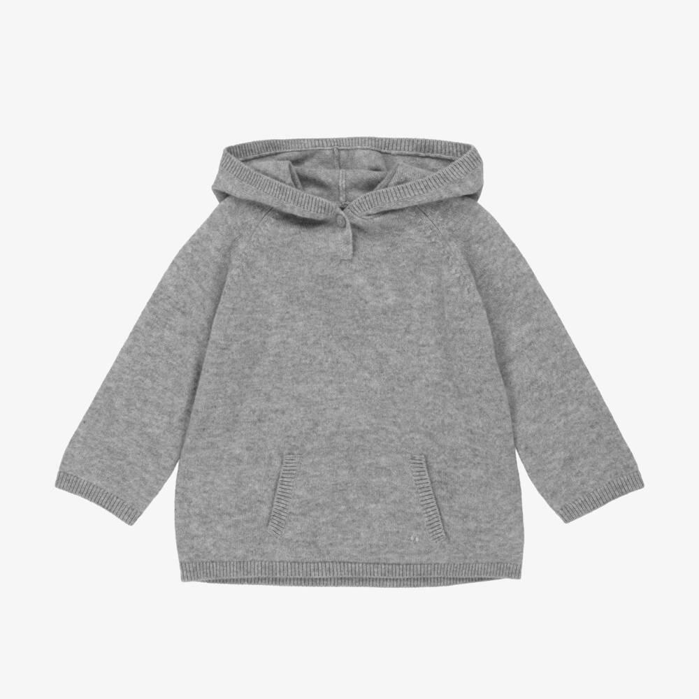 Grey hooded sweater for little boys and girls by luxury designer Bonpoint, knitted in super-soft and lightweight cashmere. It has a button fastening under the chin, cosy long sleeves and cherry logo embroidery on the front pouch pocket.