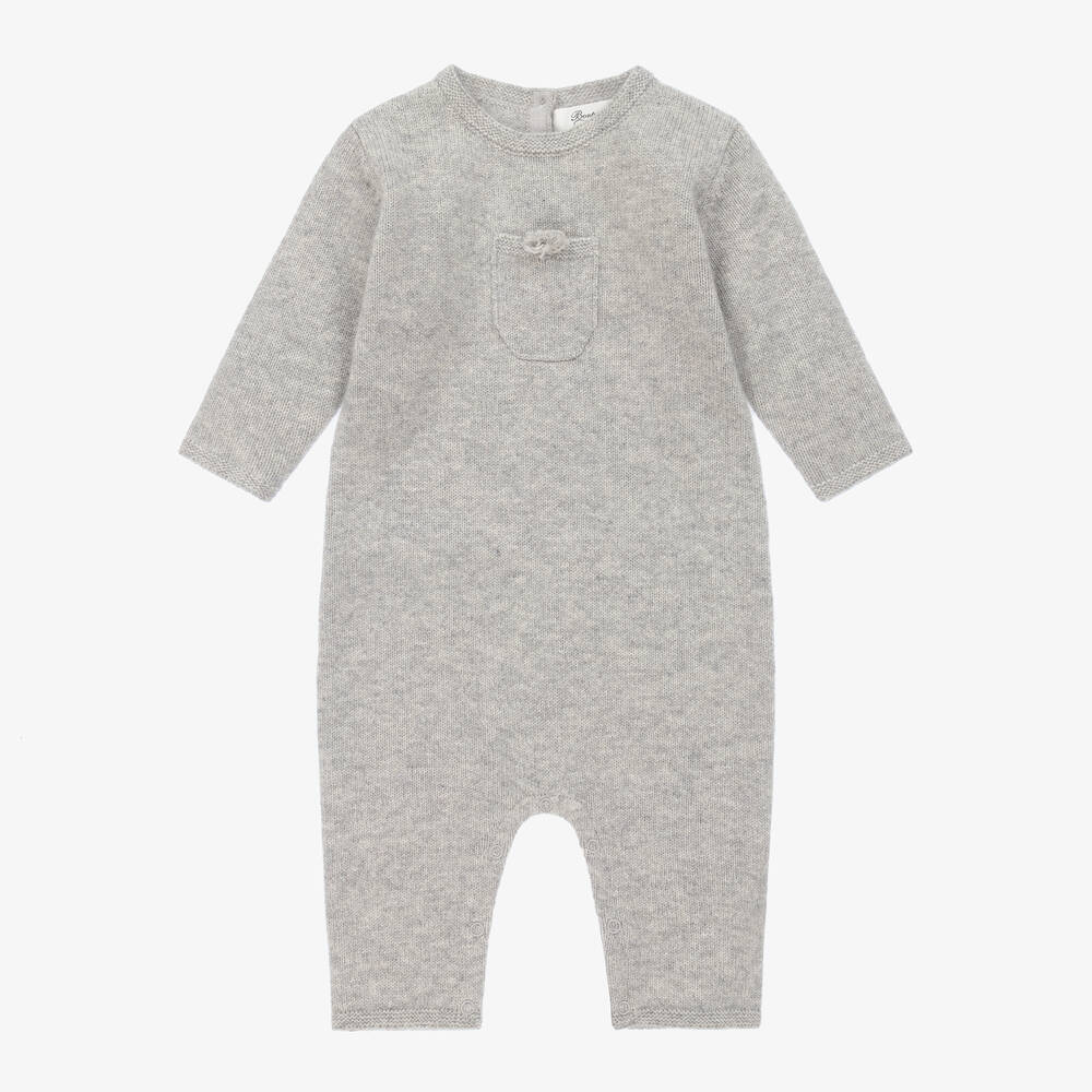 A lovely grey romper for baby boys and girls by Bonpoint, knitted in super soft cashmere. Simply designed, it has a sweet pocket on the chest with a tassel embellishment. There are practical popper fastenings between the legs for easy dressing and buttons on the back for a neat finish.