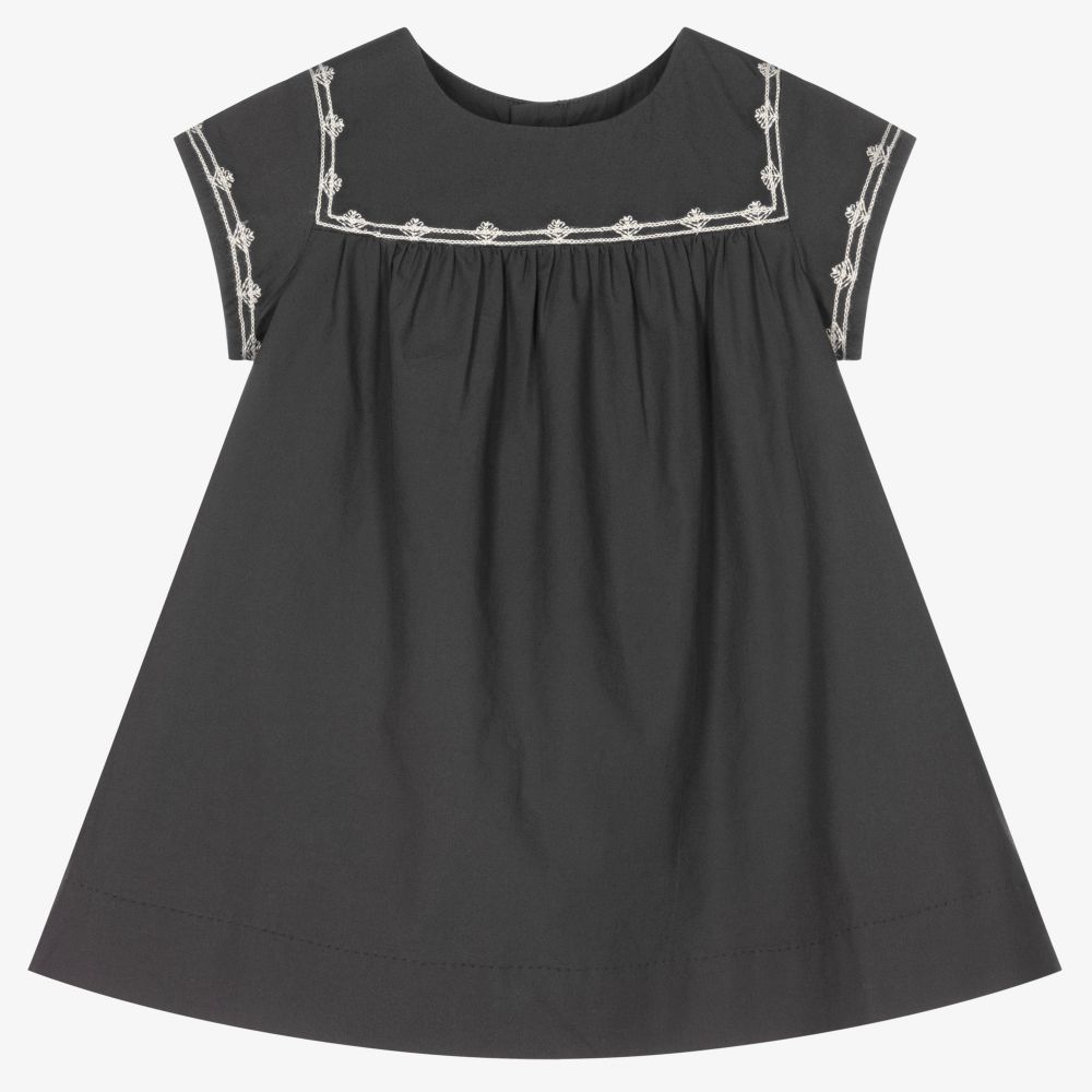 Pretty grey dress for baby girls by luxury French designer Bonpoint. Made in lightweight organic cotton, it has beautiful ivory floral embroidery on the bodice, sleeves and around the hemline.