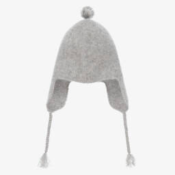 Beautifully soft grey hat for little boys and girls by Bonpoint, knitted in luxurious cashmere. It has cosy ear flaps and is secured with braided ties under the chin. Sweet tassels on the ties and on the top of the hat complete the look.
