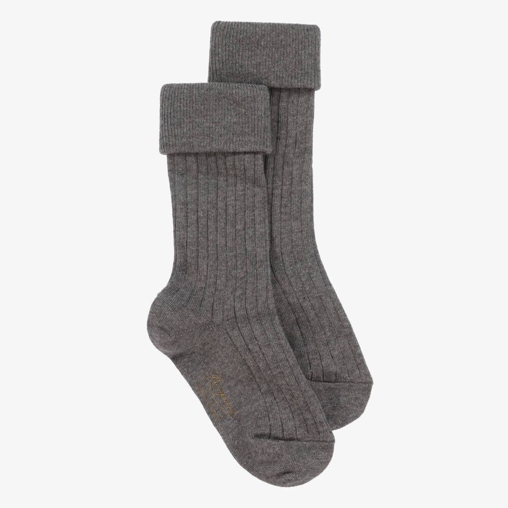 Grey cotton-rich socks for girls from luxury French brand, Bonpoint. Soft and stretchy, they have a classic ribbed pattern with turn-over cuffs and a gold logo print on the soles.