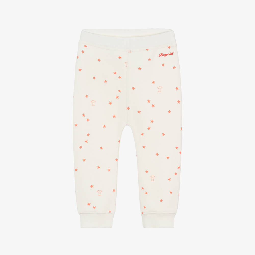 Ivory joggers for little boys and girls by luxury French brand Bonpoint, made in soft cotton jersey. Patterned with red stars and the words 'Bonpoint Club', they have cosy ribbed trims and an elasticated waist for a comfortable fit. There is a red embroidered logo just below the waist for a subtle designer finish.