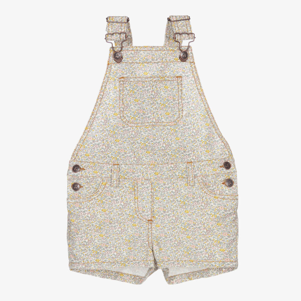 Girls ivory floral dungaree shorts from Bonpoint, with a colourful floral print. It is made in mid-weight cotton, with five pockets and logo fastening buttons on the sides. The shoulder straps are adjustable and fasten with metal clips on the front bib. There is a brown logo badge and cherry logo embroidery on the back.