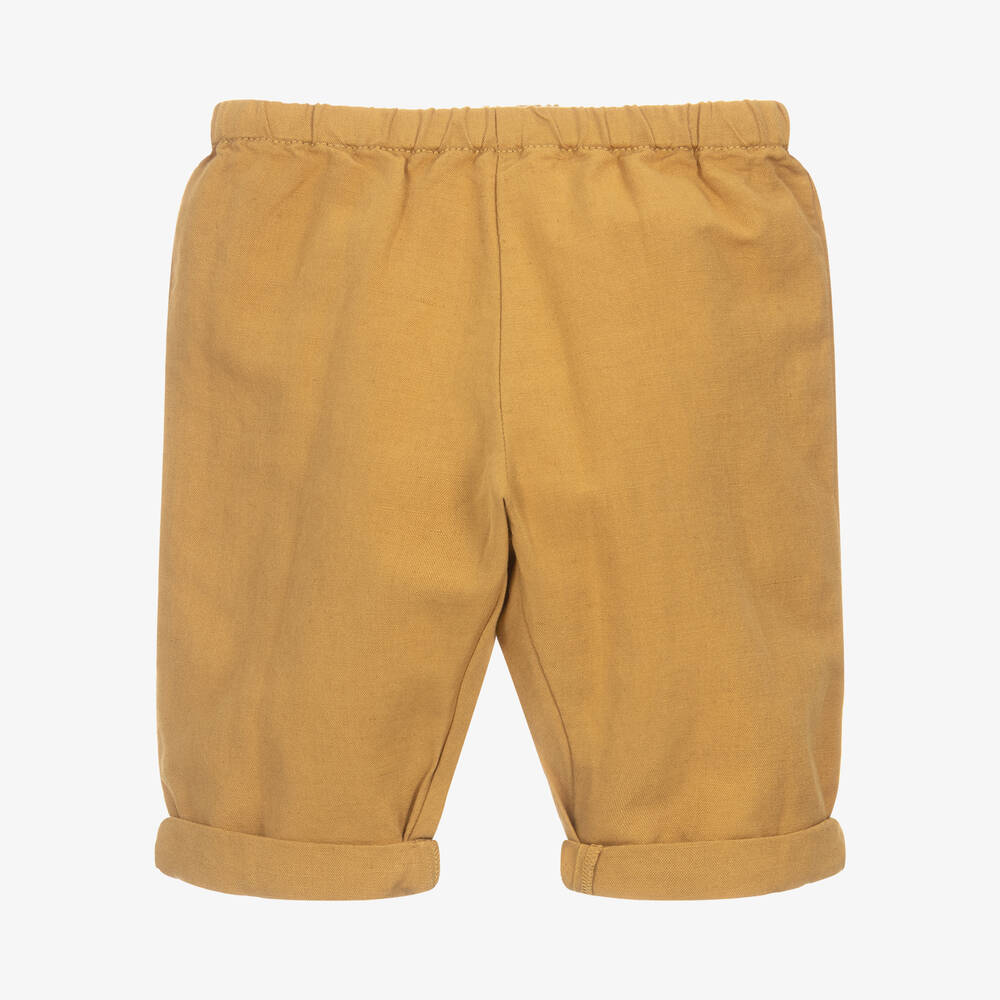 Casual ochre yellow trousers for little boys and girls by French designer Bonpoint, made in a luxurious cotton and linen blend twill. With an elasticated waistband, they pull-on easily and are comfortable to wear. They are finished with a small back pocket and cherry logo tab for a discreet designer touch.