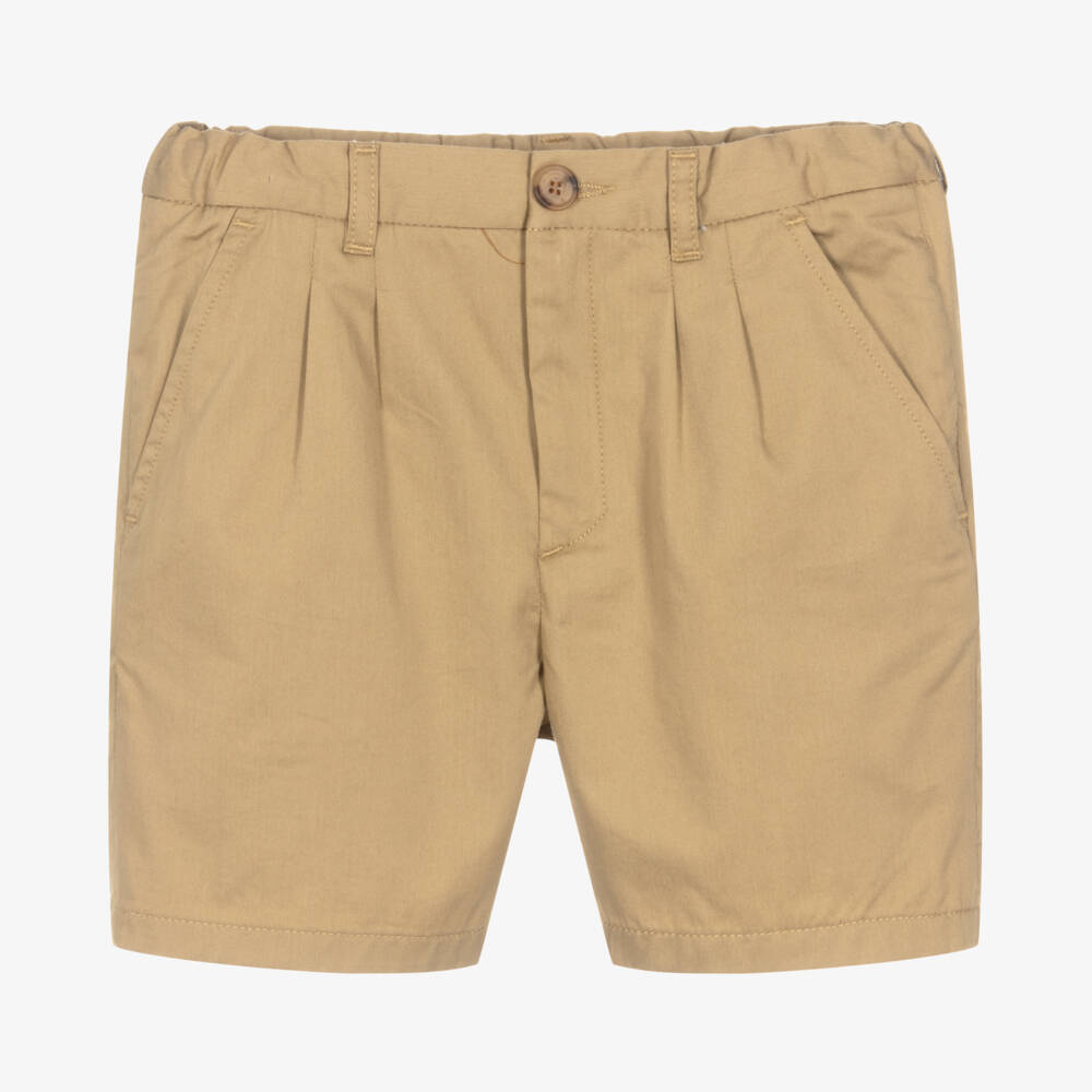 From luxury French brand Bonpoint, a pair of dark beige chino shorts for teen boys. Made in lightweight cotton twill, they have pleats on the front for a relaxed shape and slanted pockets. They fasten with a zip and branded button and have a single button-fastening pocket on the back with an embroidered logo patch for a subtle designer finish.