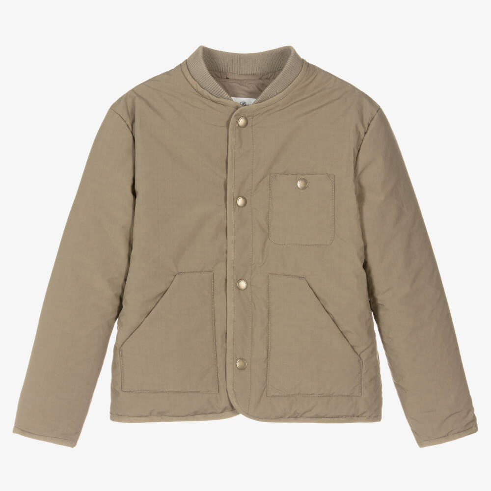 Beige jacket with pockets for teen boys by luxury brand Bonpoint, woven in soft and smooth cotton with a silky lining. Structured in a cool boxy fit, it has a ribbed collar, canvas trims and logo-engraved poppers for those signature designer details. The water-repellent finish, pack-away hood and lightweight padding ensures he will stay dry and comfortable. The fixed tuck-away hood attaches to the inner collar with buttons to ensure it fits comfortably on the head.