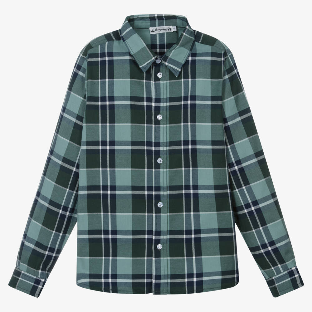 Designed by French brand Bonpoint, this green and navy blue shirt for teen boys adds a smart-casual vibe to your child's wardrobe. In a preppy check pattern, it fastens with glossy button on the collar and the cuffs. It is woven in soft and lightweight cotton for easy-to-wear comfort.
