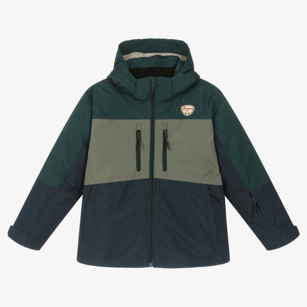 For designer appeal, this navy blue and green hooded puffer jacket for teen boys from Bonpoint, has the brand's logo patch on the chest. Warmly padded with luxurious down, it has internal stretchy cuffs with thumb holes and velcro adjusting cuffs. There is a popper-fastening inner snow skirt and an adjustable toggle hem, with a high fleece-lined collar for extra protection against the cold. The popper fastening hood can be removed for alternative styling. Zipped pockets on the front, an internal zipped and mesh pocket, as well as a useful pass pocket on one sleeve, complete the cool look.