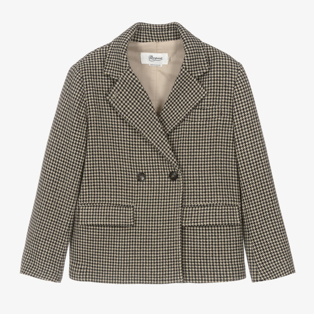 In a stylish beige and black houndstooth pattern, this double-breasted blazer for teen girls is from Bonpoint. Ideal for those smarter occasions, this lightly padded jacket is woven in a luxurious wool and cotton blend, with a lightweight cotton lining for comfort. Beautifully tailored, it has notched lapels, convenient front pockets and smart mock-horn button fastenings on the front.