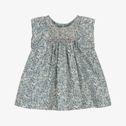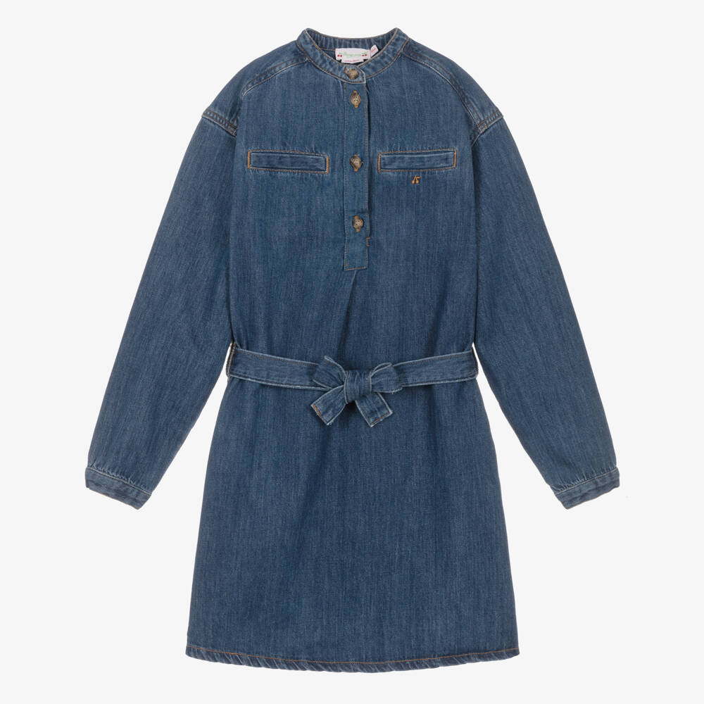 A casual blue cotton denim dress for teen girls by luxury French label, Bonpoint. Simply styled it has a collarless round neck and faux chest pockets with an embroidered cherry logo underneath for a subtly branded finish. Effortlessly stylish, it has soft pleats on the front and back for a relaxed shape with button fastening on the front and cuffs. Soft and lightweight, it has a detachable tie belt to create an alternative cinched silhouette and concealed side seam pockets.