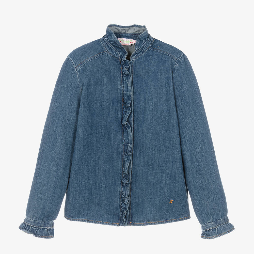 Blue cotton denim blouse for teen girls from luxury French brand Bonpoint, with an embroidered cherry logo above the hem for a subtle designer look. Designed with a washed and worn look, this mid-weight denim blouse has concealed button fastenings on the front. The feminine ruffle trims on the collar, front and cuffs give this casual piece a stylish finish.