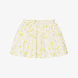 A gold-green and blue skirt for teen girls by luxury designer Bonpoint. Expertly pleated and darted, this timeless piece is designed in a wrap-around style, with smart mock horn buttons on the front. It is woven in soft, brushed wool for warmth. The waist is elasticated around the back for shape and comfort.