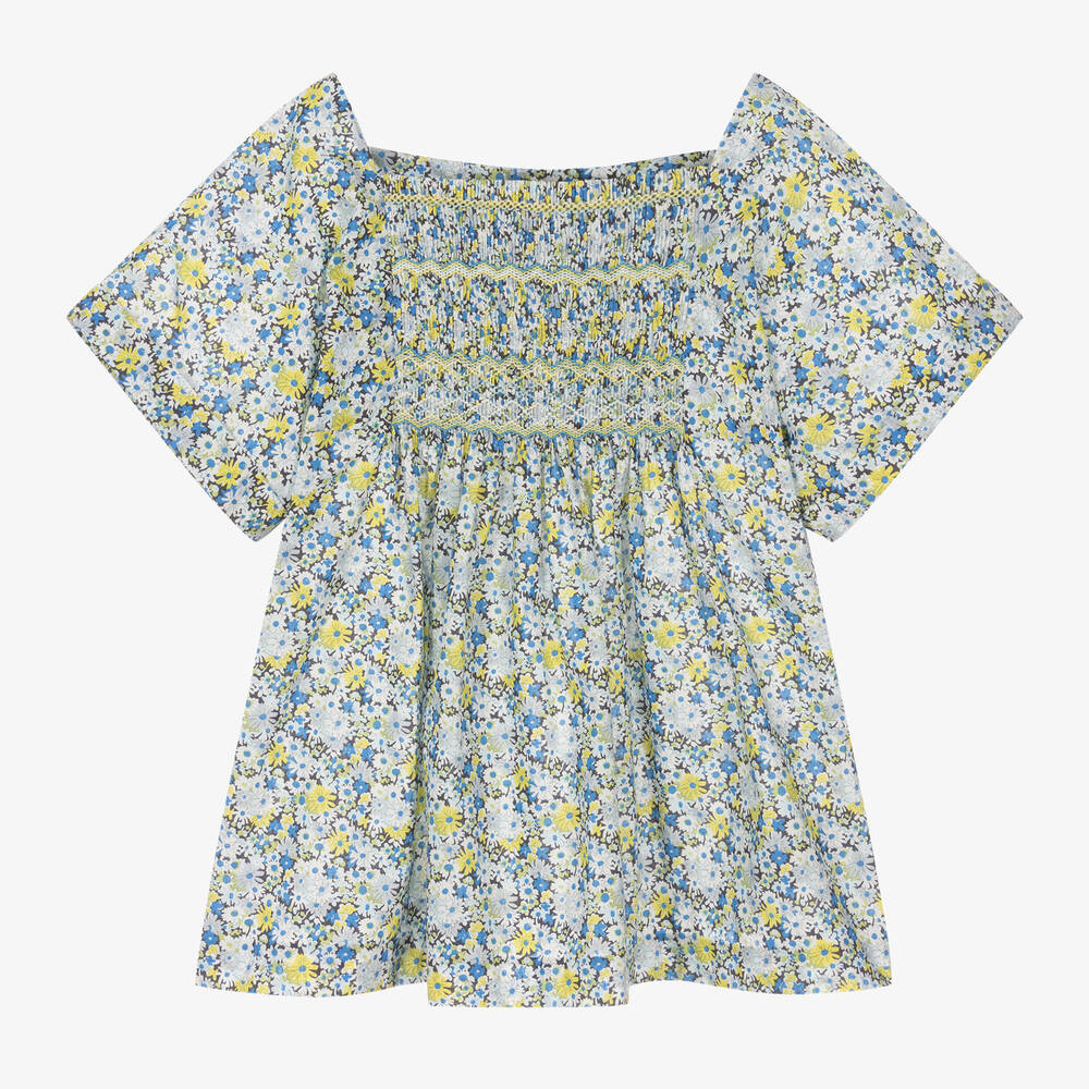 Patterned in a pretty floral Liberty print in blue and yellow, this lovely short-sleeved blouse for teen girls is by French fashion house Bonpoint. Made in luxurious Tana Lawn organic cotton, it has classic hand smocking detail on the chest, with pearlescent button fastenings on the back.