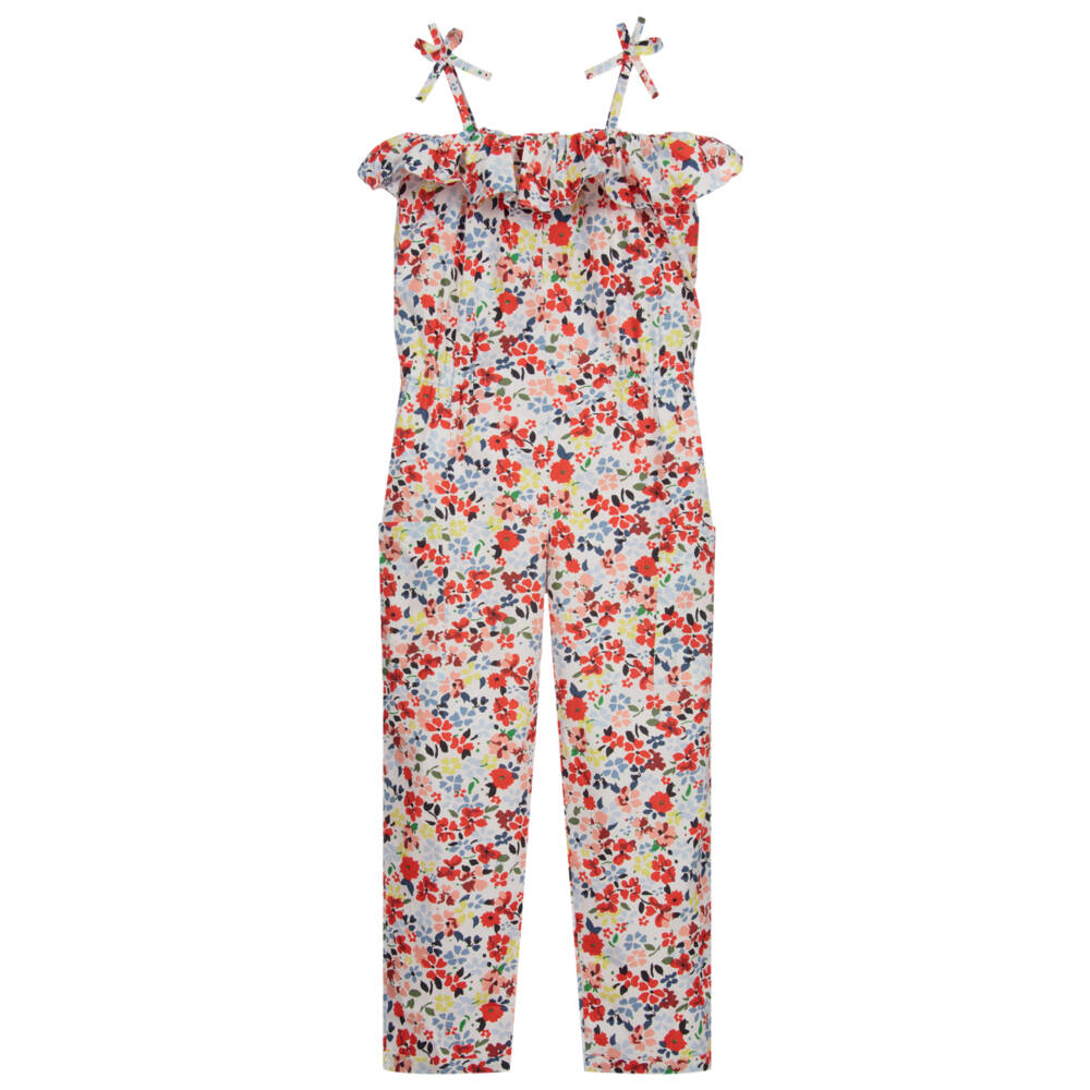 Teen girls summery jumpsuit with white, red and blue floral pattern by luxury French designer Bonpoint. This one-piece combines style with comfort and has useful patch pockets. The waist is elasticated allowing for plenty of movement whilst MAintaining a femine shape.