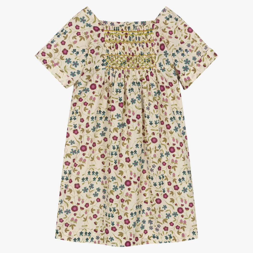 Charming ivory dress for teen girls by French brand Bonpoint, with a pretty floral Liberty print in shades of green, purple and blue. Echoing a touch of traditional styling, it has beautiful smocking with hand-embroidered details on the front. This lovely dress is made of soft, lightweight Tana Lawn cotton and fastens on the back with mother-of-pearl buttons.