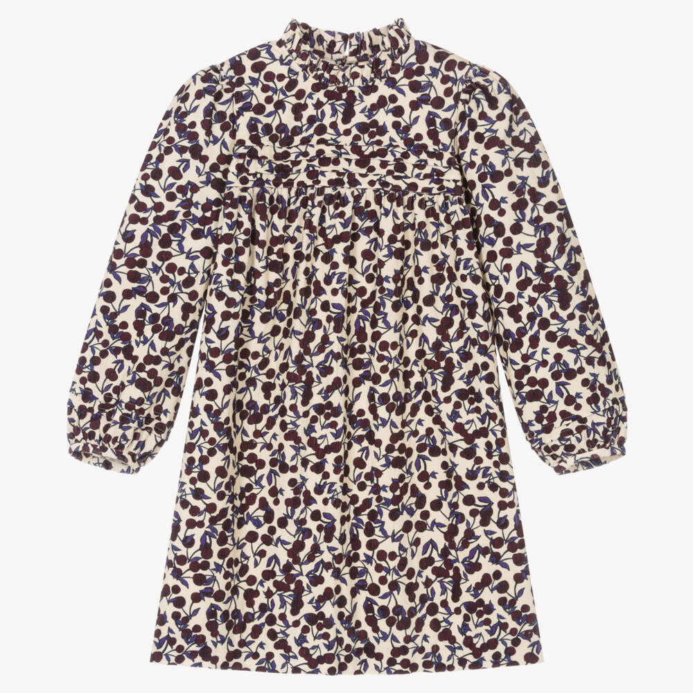 Beautiful ivory and purple dress for teen girls by French brand Bonpoint, with an eye-catching berry pattern. Made in luxurious cotton corduroy, it has an elegant ruffled collar and pintuck detail on the bodice and cuffs. The dress has stylish lantern sleeves and falls in gathers from the bodice at the front. The dress fastens with buttons on the back and is lined in lightweight cotton for comfort.