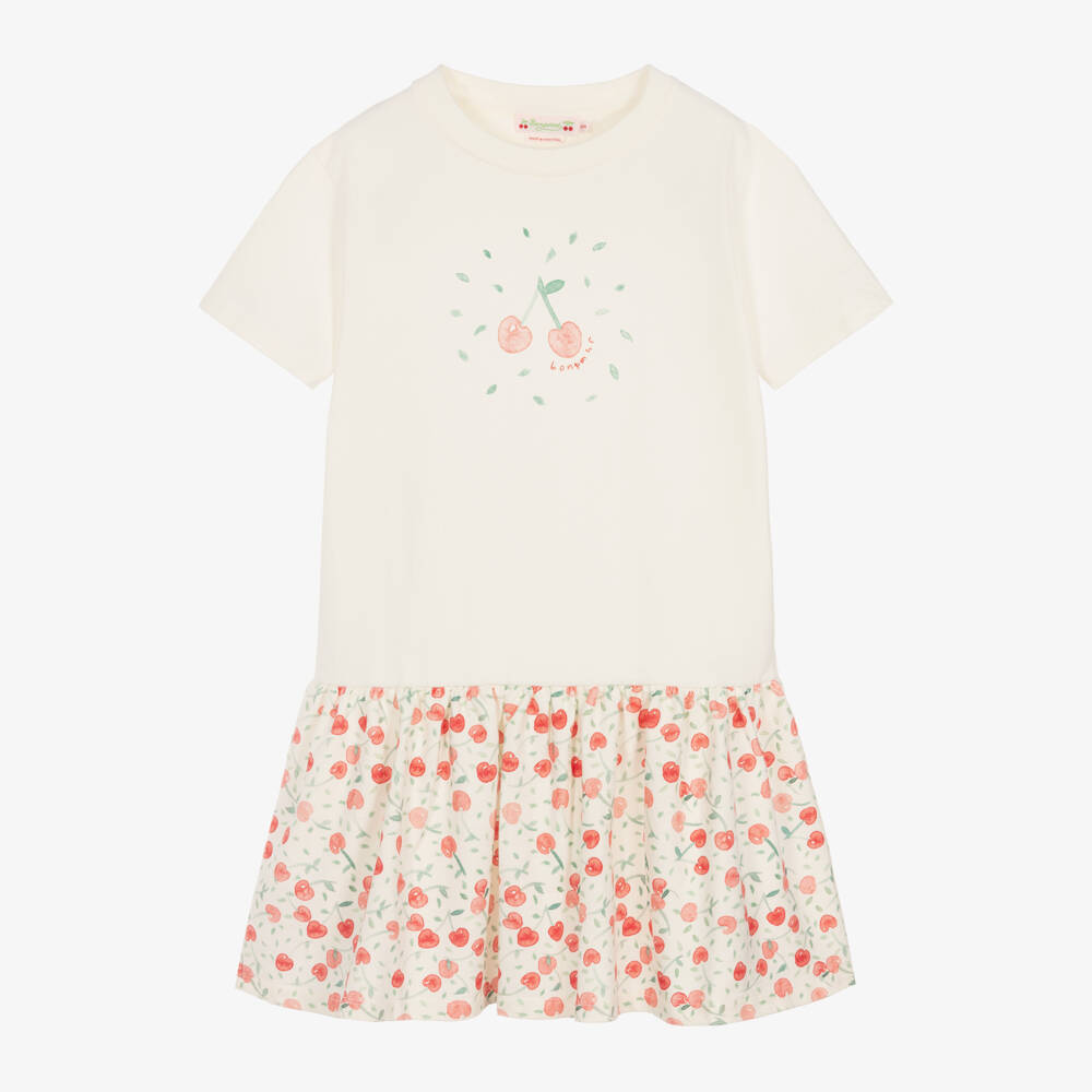 Adding an unmistakable designer touch to casual days, this off-white dress for teen girls is by classic French brand Bonpoint. It has the designer's signature red cherry logo printed on the front, with an embroidered logo below, and coordinating cherries on the gathered, drop-waisted skirt. Just right for getting up and going, the dress is easy to wear, simply slipping on.