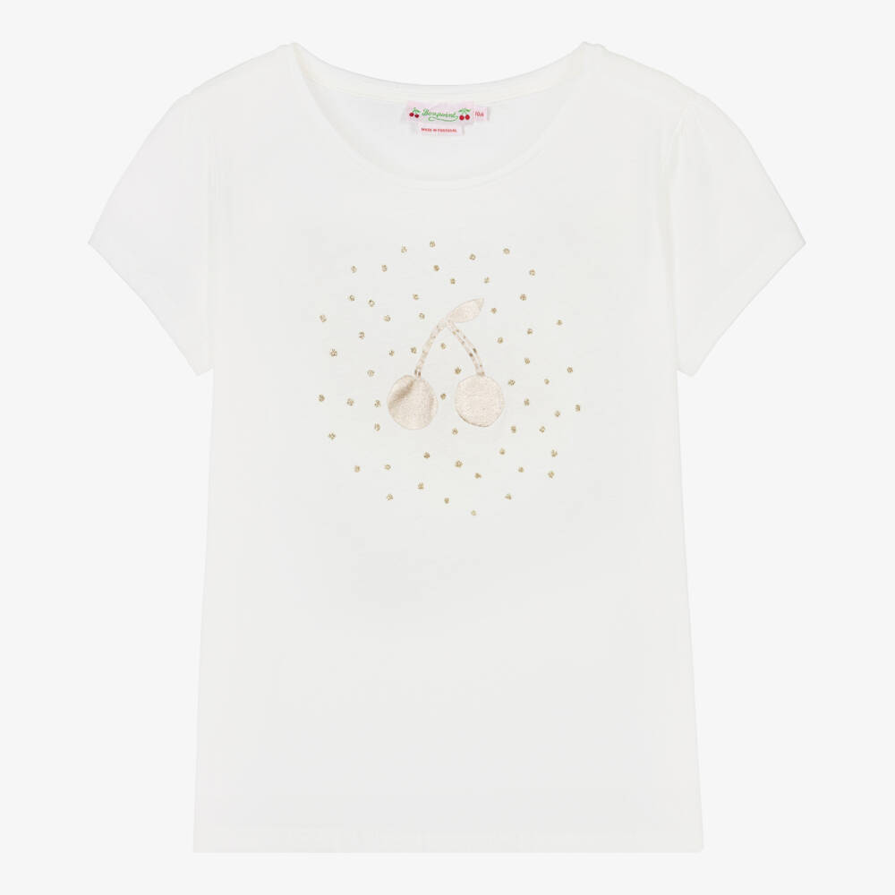 A white T-shirt for teen girls with feminine, puffed, short sleeves by classic French designer Bonpoint. Unmistakably by the brand, it has the signature cherries printed on the front in glamourous gold, surrounded by glittery gold spots, and embroidered cherries by the hemline for a little extra designer touch. Endlessly comfortable, it is made in super soft jersey.