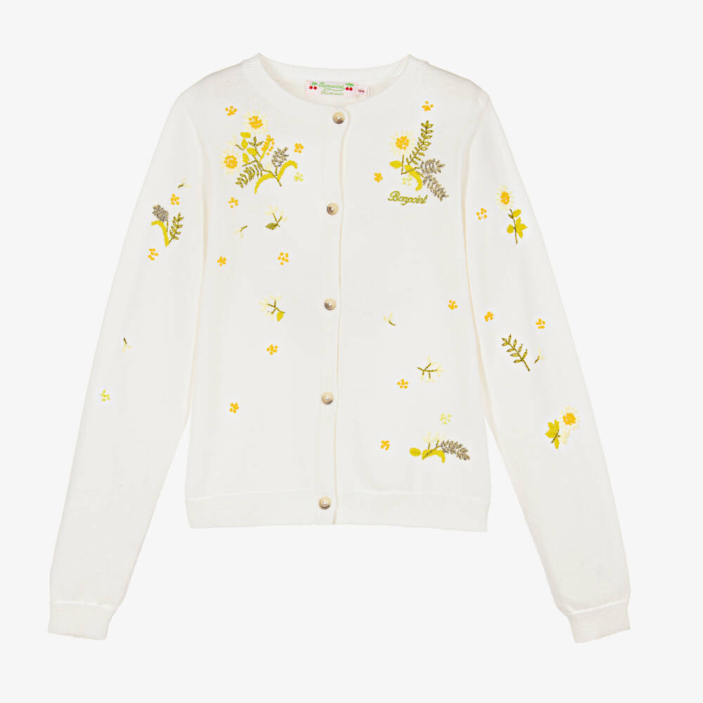 Teen girls will add some luxury to their outfit with this pretty ivory cardigan by French brand Bonpoint. Made in a lovely fine knit, this soft and warm layer is detailed with an intricate floral design incorporating glittery green hand-embroidery and the designer's name on the chest. An extra cosy choice, it features a ribbed neckline and cuffs and front button fastenings.