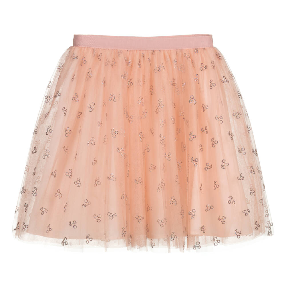 Teen girls dusky pink tulle skirt by French brand Bonpoint. The tulle overlay is decorated with metallic rainbow coloured cherries, the brand's signature logo. The waistband is elasticated and there is a tulle underlay and satin lining.