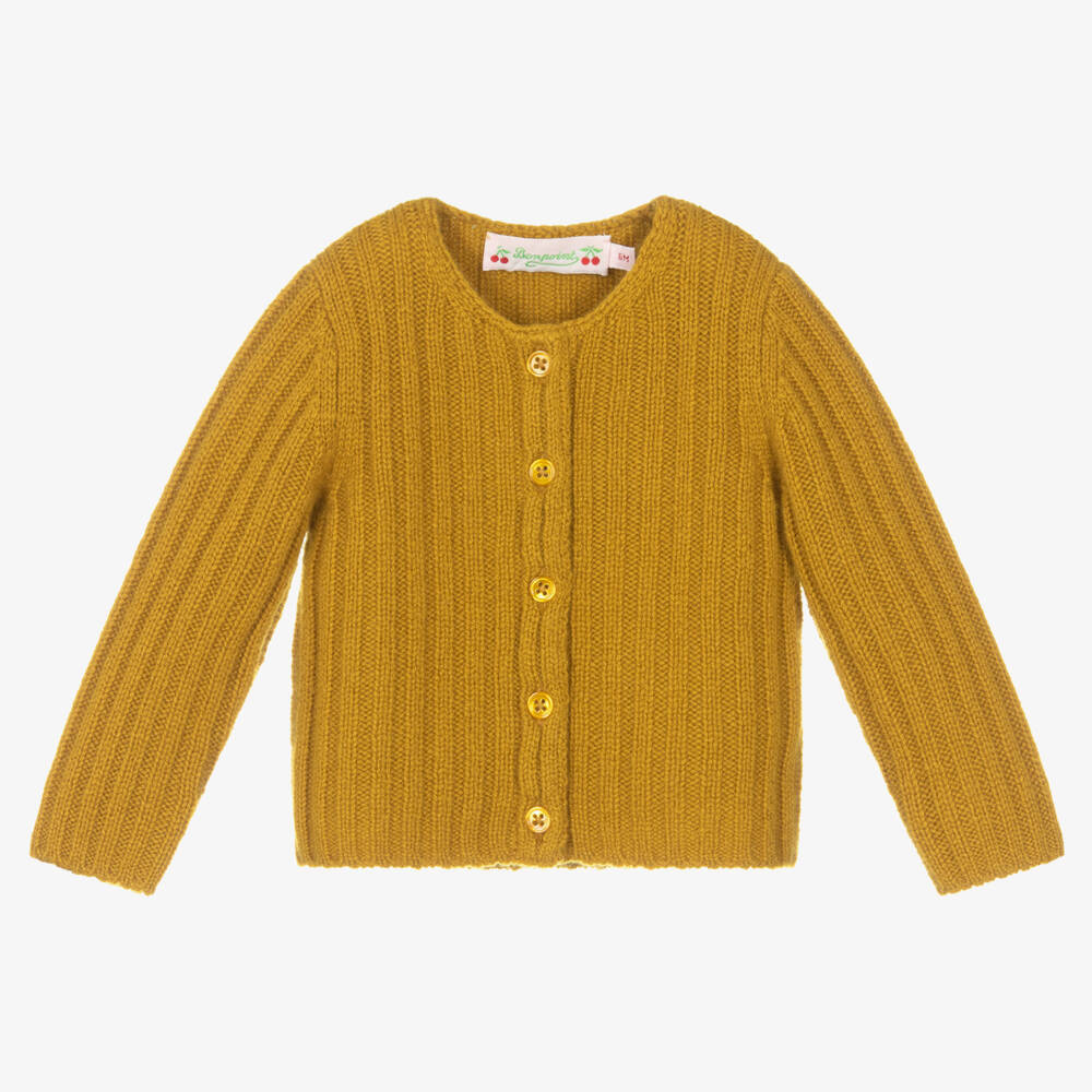 Mustard yellow cardigan for little boys and girls from luxury French brand, Bonpoint. It is knitted in super-soft and cosy cashmere, with a lovely ribbed pattern and a crew neckline.
