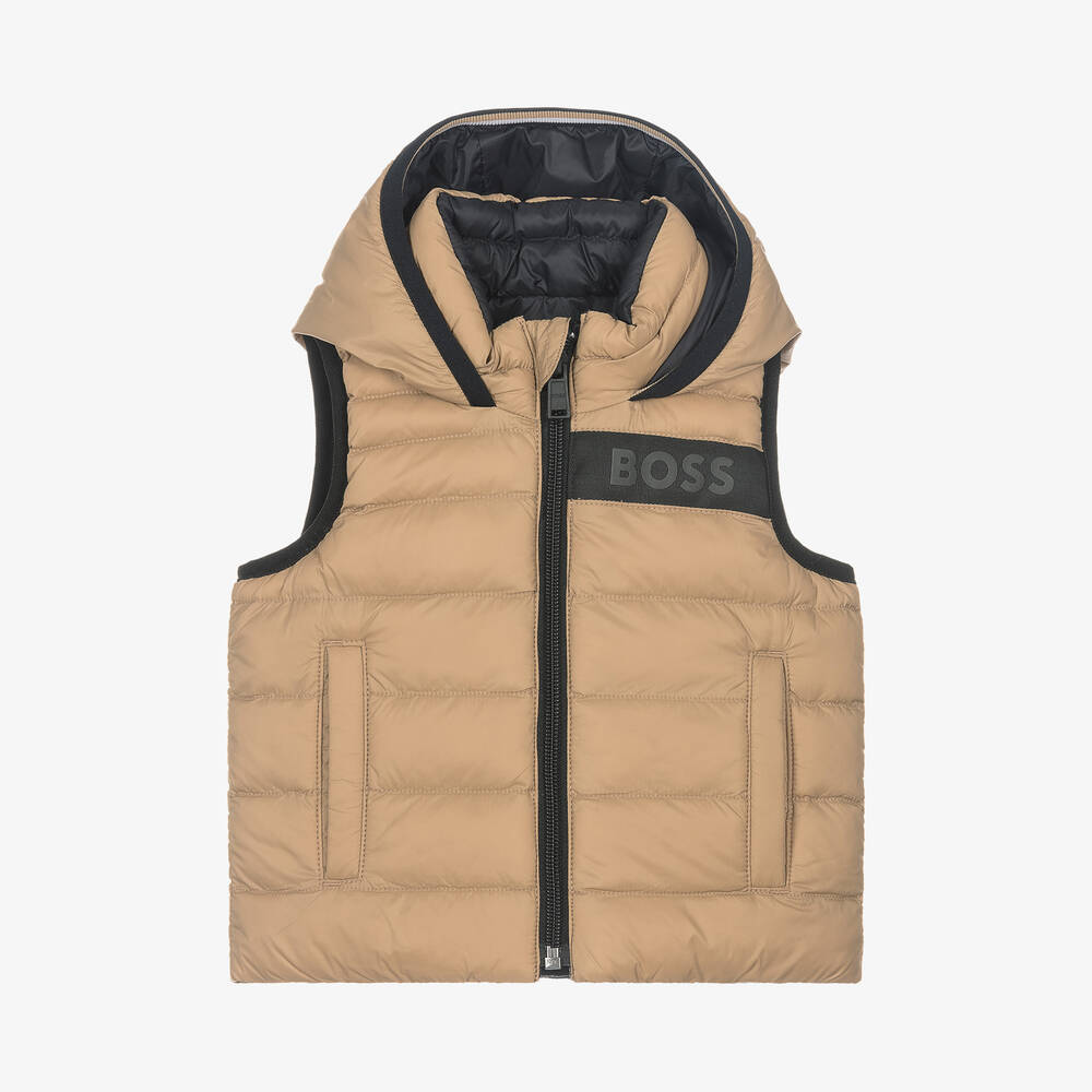 Baby boys reversible hooded gilet by BOSS, in the brand's signature beige and black colourways. Ideal for layering on cooler days, it is warmly padded and made in a water-repellent fabric with a silky smooth feel. The beige side has a black logo panel on the chest and front pockets, whilst the reverse, black side has a small logo print and side seam pockets. It fastens easily on the front and has a protective chin guard for comfort.