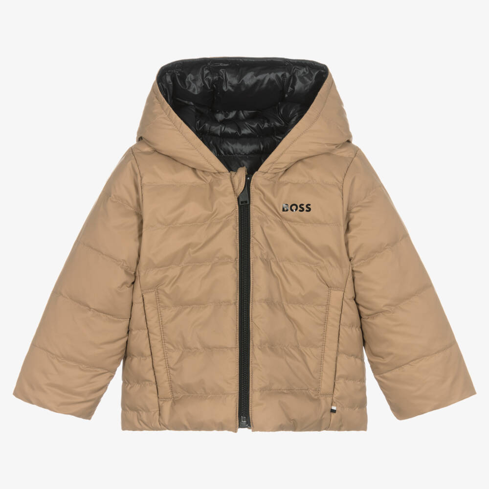 Reversible beige and black hooded puffer jacket for baby boys by BOSS. Made in silky smooth, water-repellent fabric, the jacket is lightly padded with down for cosy warmth without the weight. Both sides have logo branding on the chest and concealed pockets to keep little hands warm.