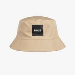 Beige bucket hat for baby boys by German brand BOSS, woven in smooth cotton twill. For a distinctive designer look, it has a Double B monogram embroidered in white on the front.