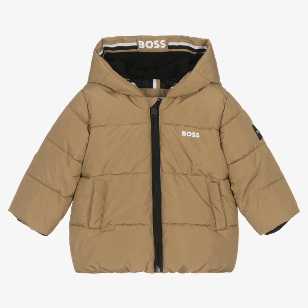 Cool dark beige zip-up puffer jacket for baby boys by BOSS. Logo branded throughout, it has a rubberised patch on one sleeve, white logo prints and the brand's iconic beige, white and black striped trims. Silky smooth and warmly padded, it is made from recycled fibre. The hood and pockets are fleece-lined for cosiness and there are elasticated hem and ribbed cuffs to keep the cold air out. The chin guard over the zip prevents rubbing. This item contains at least 60% recycled material.