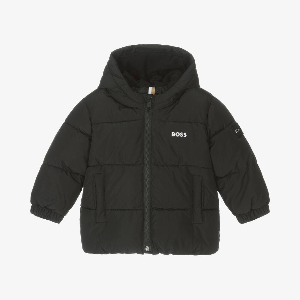Black puffer coat for baby boys by BOSS, made in soft, smooth fabric, with a silky lining. Water repellent and warmly padded, the fixed hood and front pockets are lined with fleece for extra cosiness. It fastens with a branded zip on the front with a useful chin guard. For a subtle designer finish, there is a white logo printed on the front, signature striped trim inside the neck and a rubberised black logo patch on one sleeve. This product is made with at least 70% recycled fabric.