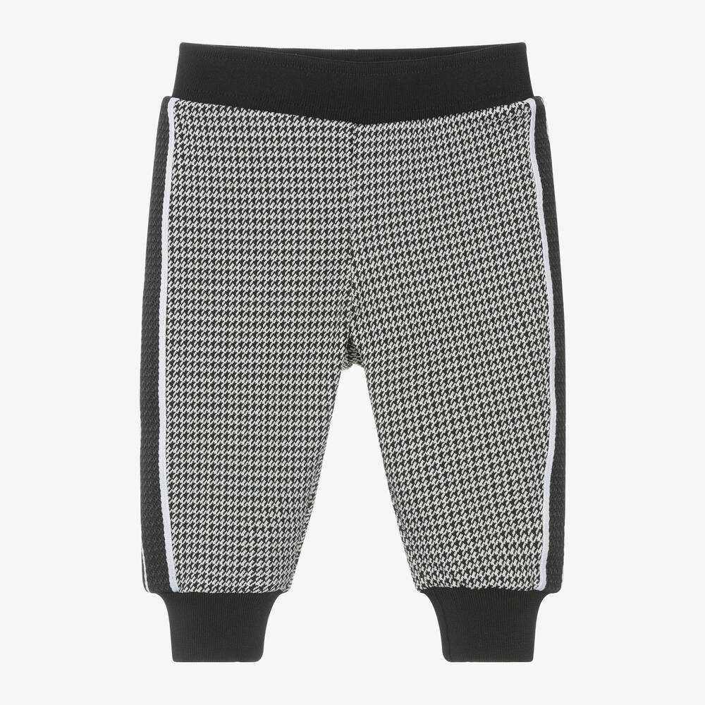 Black and white joggers for little boys by BOSS, with a houndstooth pattern. Made in soft, comfortable jersey, these casual, cuffed joggers have black and white taped trims down the sides of each leg adding a sporty touch. They have a gently elasticated waistband for comfort, with a small logo tab on one side seam adding a subtle designer touch.