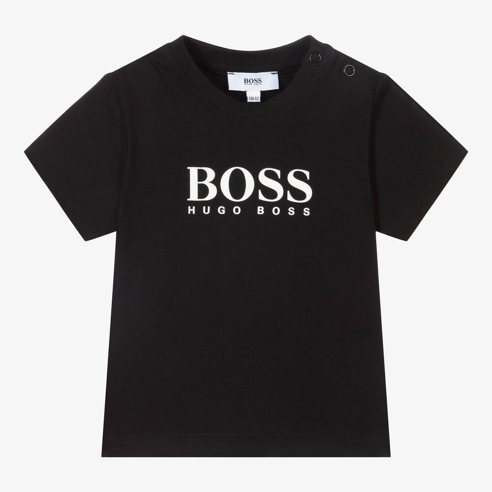 Logo-inspired black T-shirt for little boys, by BOSS. Made from cotton jersey, it has the brand's white rubberised logo on the front, and poppers fastenings on one shoulder for easy dressing.