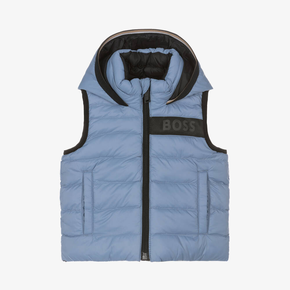 Baby boys reversible hooded gilet by BOSS, in blue and black colourways. Ideal for layering on cooler days, it is warmly padded and made in a water-repellent fabric with a silky smooth feel. The blue side has a black logo panel on the chest and front pockets, whilst the reverse, black side has a small logo print and side seam pockets. It fastens easily on the front and has a protective chin guard for comfort.