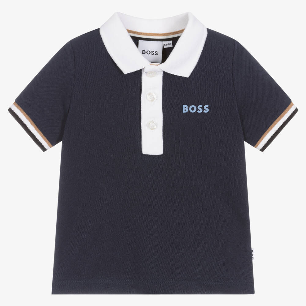 Baby boys navy blue Mini-me polo shirt from BOSS, made in soft cotton piqué. Traditionally styled, this wardrobe staple has a white collar and button placket to catch the eye. The brand's signature stripes are on the sleeve cuffs and a rubberised logo is on the chest for an extra branded touch.