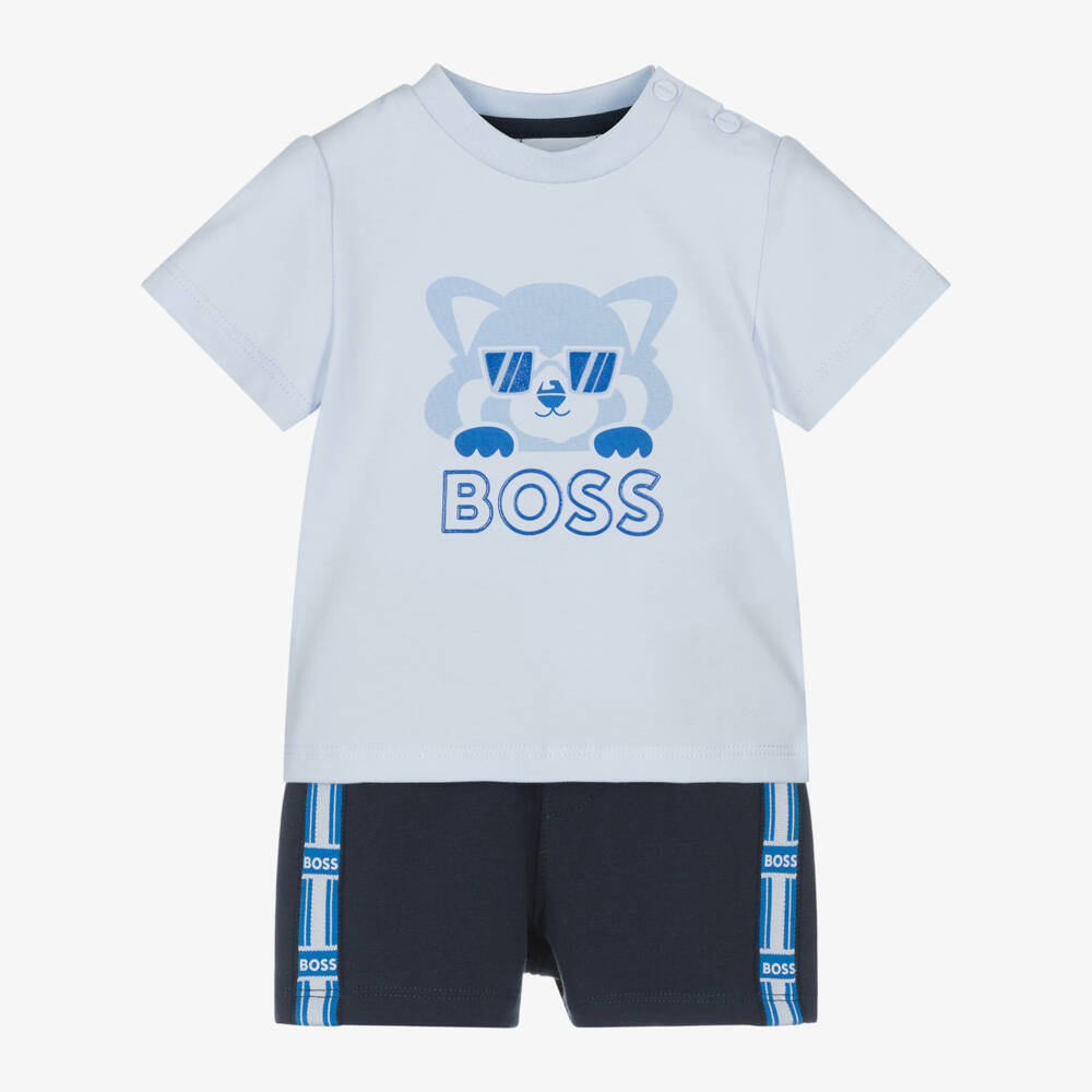 Casual and comfortable for baby boys, an organic cotton jersey shorts set by BOSS. The pale blue T-shirt has a cute red panda motif on the front, with the signature BOSS logo. Poppers on one shoulder assist with dressing. The navy blue shorts are trimmed with logo tape down the sides and have a gently elasticated waist. The set comes in a branded gift box, making it an ideal present for a new arrival.