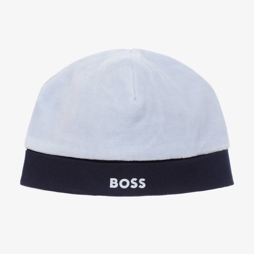 Pale blue organic cotton hat for baby boys by BOSS, made in soft and cosy velour. The comfortable jersey lining and turned up brim are in contrasting navy blue, with the designer's logo printed on the front for a branded finish.