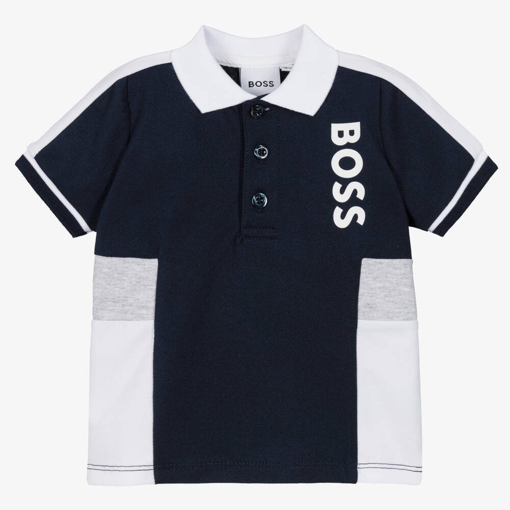 Navy blue and white polo shirt for baby boys from BOSS, made in soft cotton-blend piqué. This classic smart-casual style has white trim on the ribbed collar and across the shoulders, with grey marl and white panels on the front. For a designer finish, it has a white logo print on the chest and fastens with buttons at the front.