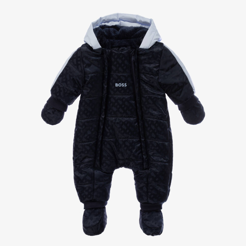 Navy blue with pale blue trims, this softly padded snowsuit for baby boys is by BOSS. For a distinctive look, it features the designer's tonal monogram logo pattern, with a white logo print on the front. Silky smooth and water repellent, it has a warm plush lining and comes with detachable mittens and booties for added cosiness. There's a double zip fastening on the front for easy dressing, with ribbed trims for a snug fit.