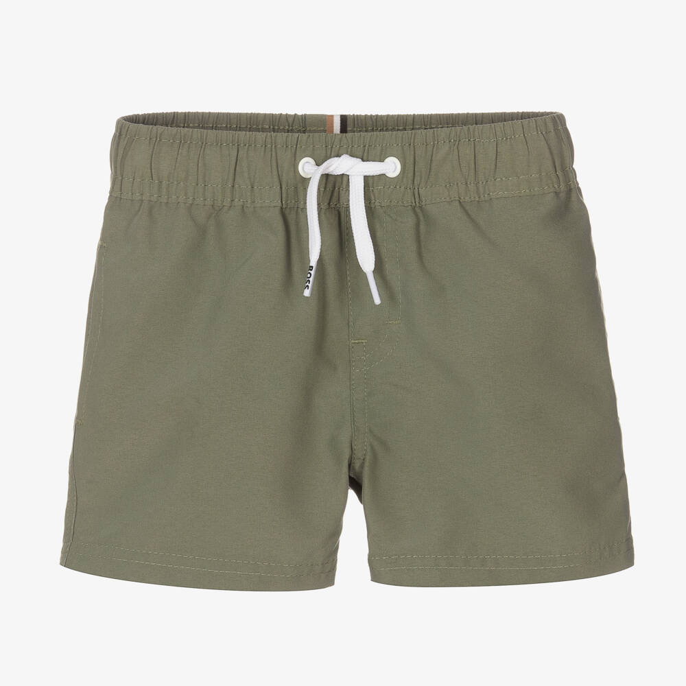 Green swim shorts for baby boys from BOSS. Silky and smooth, they have a magic monogram logo print that appears when they get wet. The waist is elasticated and adjustable with a drawstring for comfort.