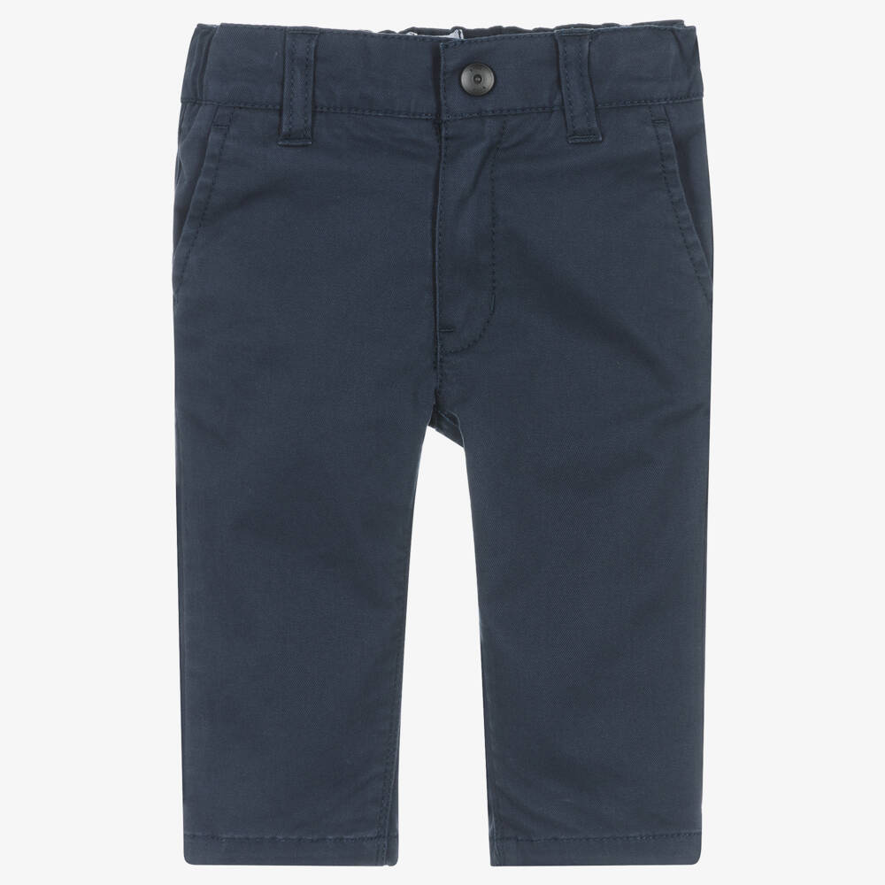 Smart casual navy blue chino trousers for baby boys by BOSS, made in soft cotton twill with a slight stretch. They are styled with slanted front pockets and two back pockets, one with the brand's signature tricolour trim. There is a hook and zip fastening on the front, with a decorative black logo button on the front of the adjustable waistband.