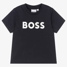 Cool navy blue short-sleeved T-shirt for baby boys from BOSS, made in soft cotton jersey. This casual wardrobe staple has a bold white logo printed on the chest and popper fastenings on one shoulder to help with dressing.