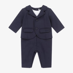 A navy blue romper for baby boys by BOSS, made in mid-weight organic cotton jersey. In a sweet varsity style, it has contrasting white sleeves and stretchy ribbed trims. The brand's Double B monogram appliqué adds instant designer appeal and it fastens neatly with branded poppers.