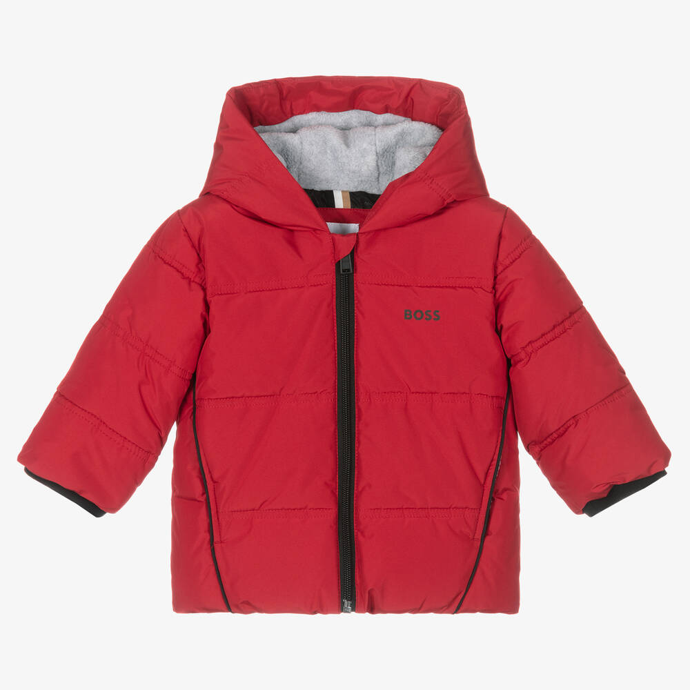 Red hooded puffer jacket for baby boys by BOSS, made from Thermolite® recycled polyester. Silky smooth and water repellent, it is warmly padded and has black ribbed cuffs to help keep out chilly winds. Front zip fastening, it has a small black logo print on the chest with a larger one on the back. The hood and pockets are lined in cosy polar fleece, and the main silky lining has an all-over logo print. This garment is made with a minimum of 60% certified recycled material, for a reduced impact on the planet.