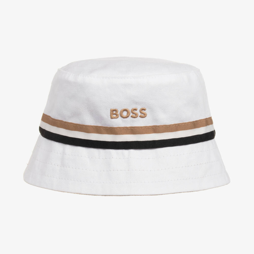 Cute white and beige bucket hat for baby boys by BOSS. Woven in lightweight cotton twill, the plain beige side has a white outline logo print on the front for instant brand recognition. The reverse white side is striped in the designer's signature colours of black, white and beige, and has a beige logo embroidered in the centre. It has a wide brim, ideal for shielding your little one's eyes from the sun.