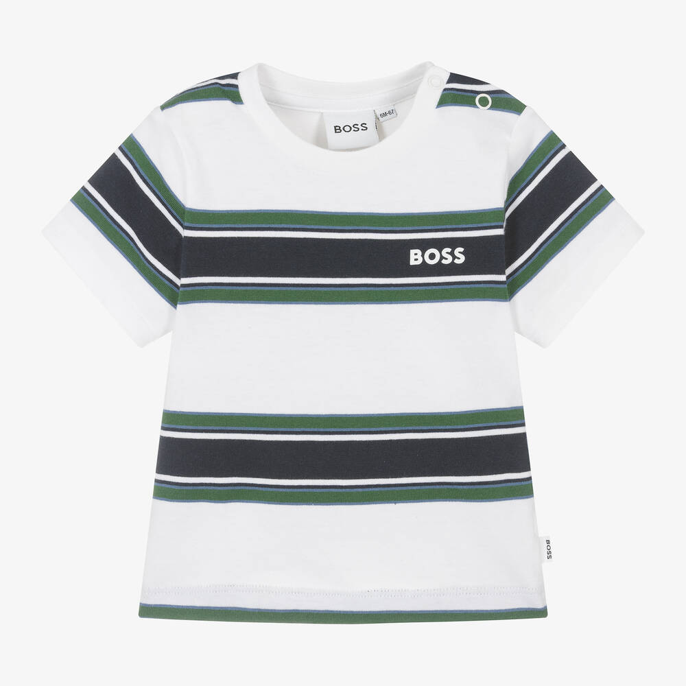 A white cotton T-shirt for baby boys by BOSS, with a navy blue and green striped design. Made in soft jersey, this short-sleeved tee has a white logo printed on the chest, with poppers on the shoulder to help with dressing.