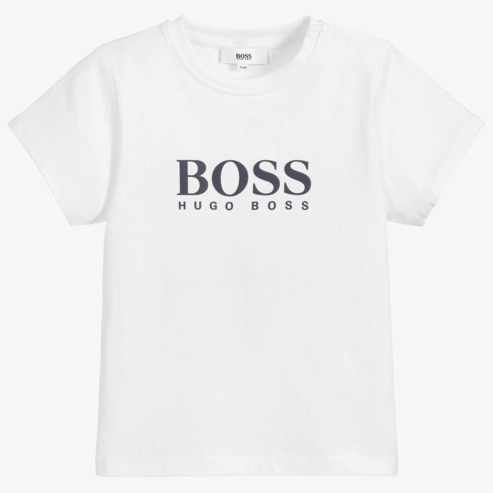 Logo-inspired white T-shirt for little boys, by BOSS. Made from cotton jersey, it has the brand's navy blue rubberised logo on the front and poppers fastenings on one shoulder for easy dressing.