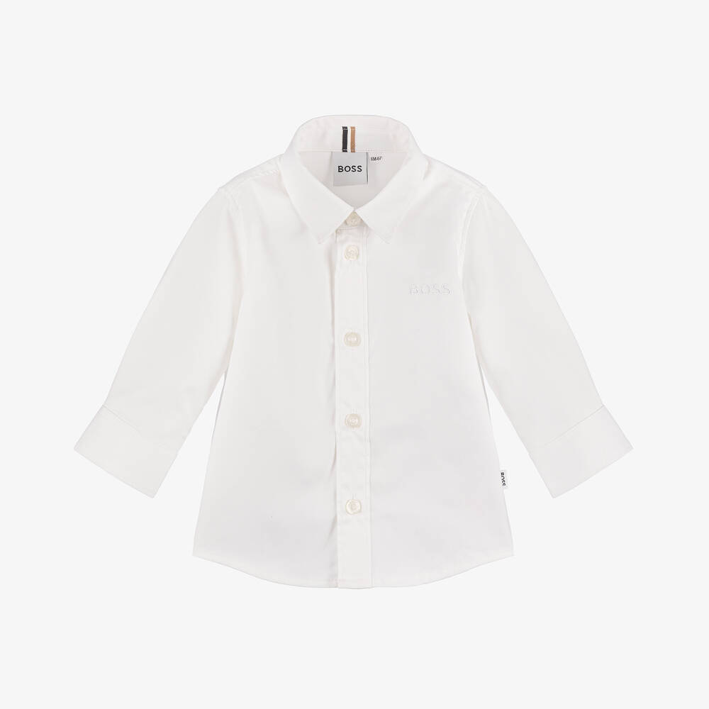 Smart, white Mini-me Oxford cotton shirt for baby boys by BOSS, with logo embroidery on the chest. Soft and lightweight, it is classically styled with long sleeves, a pointed collar and a curved hem. It fastens with branded buttons on the front and cuffs and has a logo label on one side seam. A tri-colour, grosgrain tab is sewn on the back of the neck in black, white and beige for a signature finish.